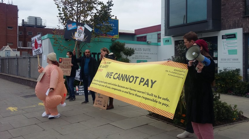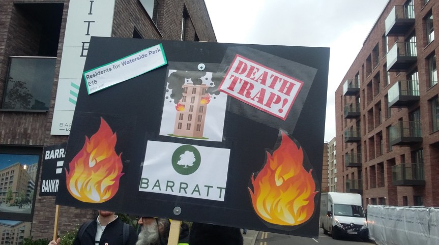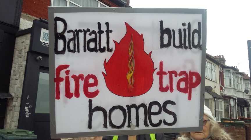 FoQM bumped into local campaigners who have moved into homes on the new Boleyn Grounds development called Upton Gardens built by Barratt Homes who claim to build “Homes of the Highest Quality”, but sadly the residents are experiencing cladding issues under the fake brick slip façade that they say put their lives in danger and out of pocket.