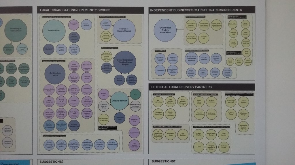 Fancy architects and engagement people are being shipped in from outside of the borough and they have more say than local people who rely on Queen’s Market as a lifeline. Below is a section of a stakeholder mapping chart where you can read the names of many organisations that are not near Queen’s Market but suddenly have more say in what happens, while locals are not allowed on the working groups due to arbitrary rules. We think this is a ploy by the Council and its consultants to undermine the local people’s voices that clearly want to “save Queen’s Market” and “keep it in public hands”.